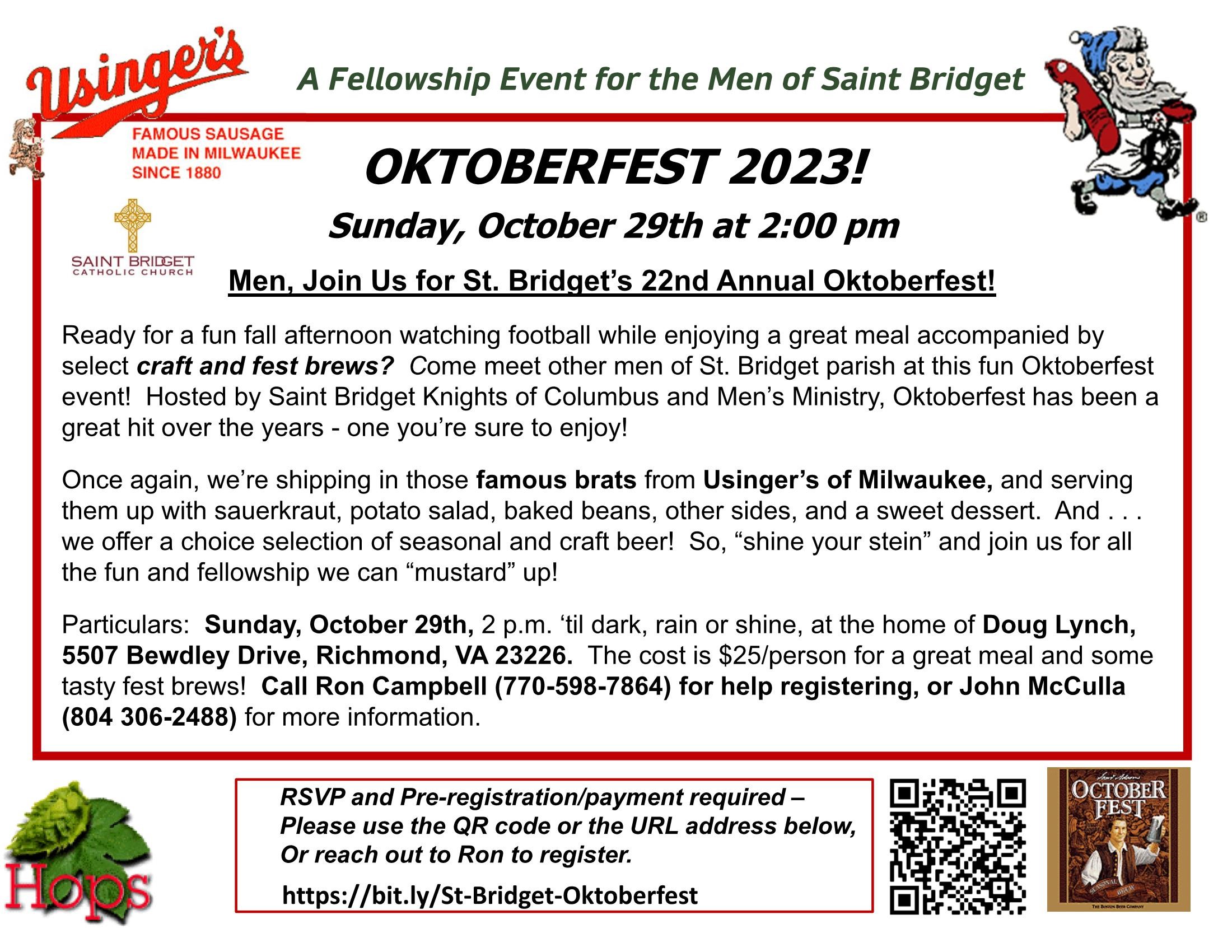 Saint Bridget Knights of Columbus and the Men's Ministry are teaming up to host an amazing event for the men of Saint Bridget Parish! Join us Sunday, October 29th for craft brews, brats, and sides. This will be fun! Thanks to Doug Lynch for hosting at his home 5507 Bewdley Drive, Richmond, VA 23226. The cost to attend is $25 a person. Please register using the QR code or this link (same as the link above).