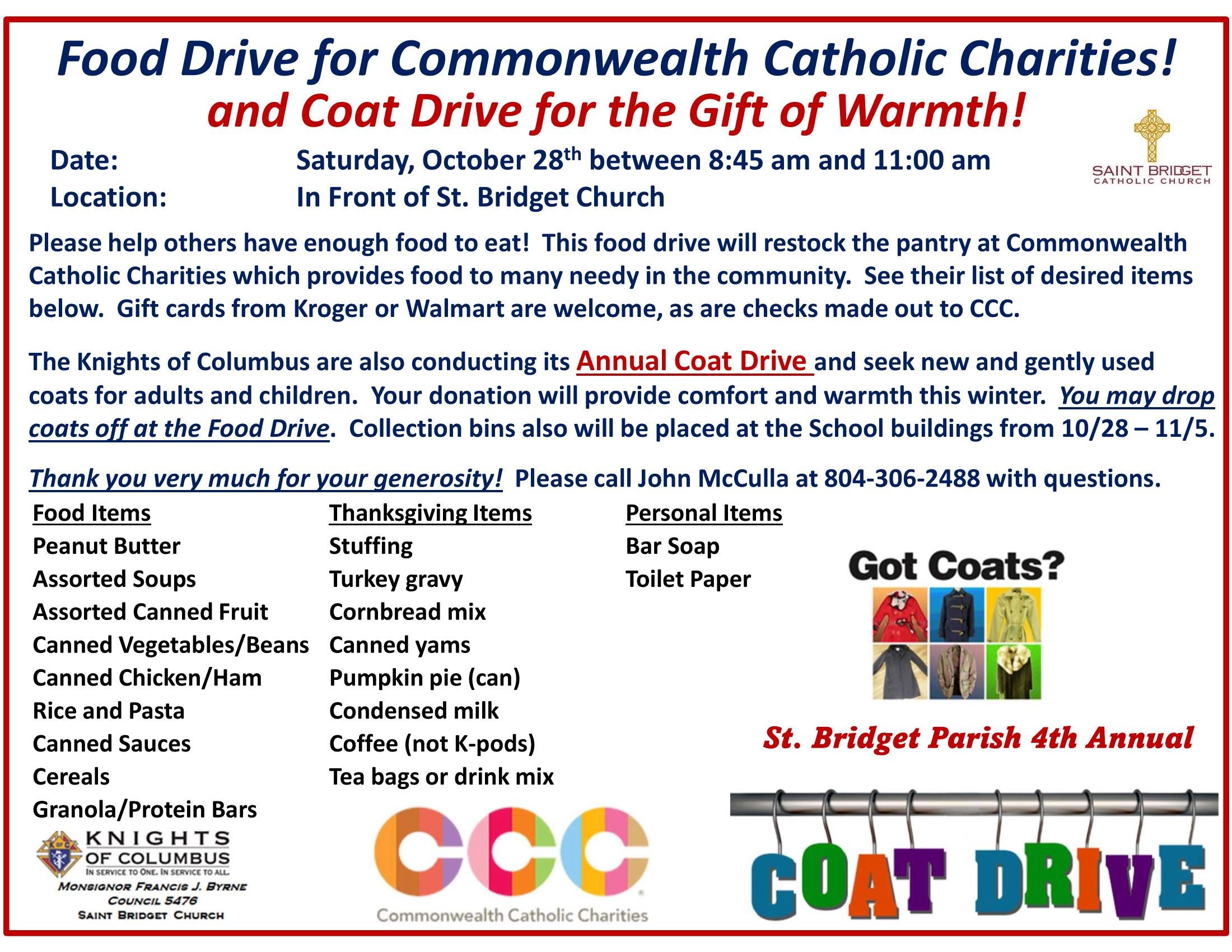 The Knights of Columbus will host a food & coat drive on Saturday, October 28th from 8:45-11 am in the front of Saint Bridget, with bins for coats available through November 5th located at Saint Bridget School.